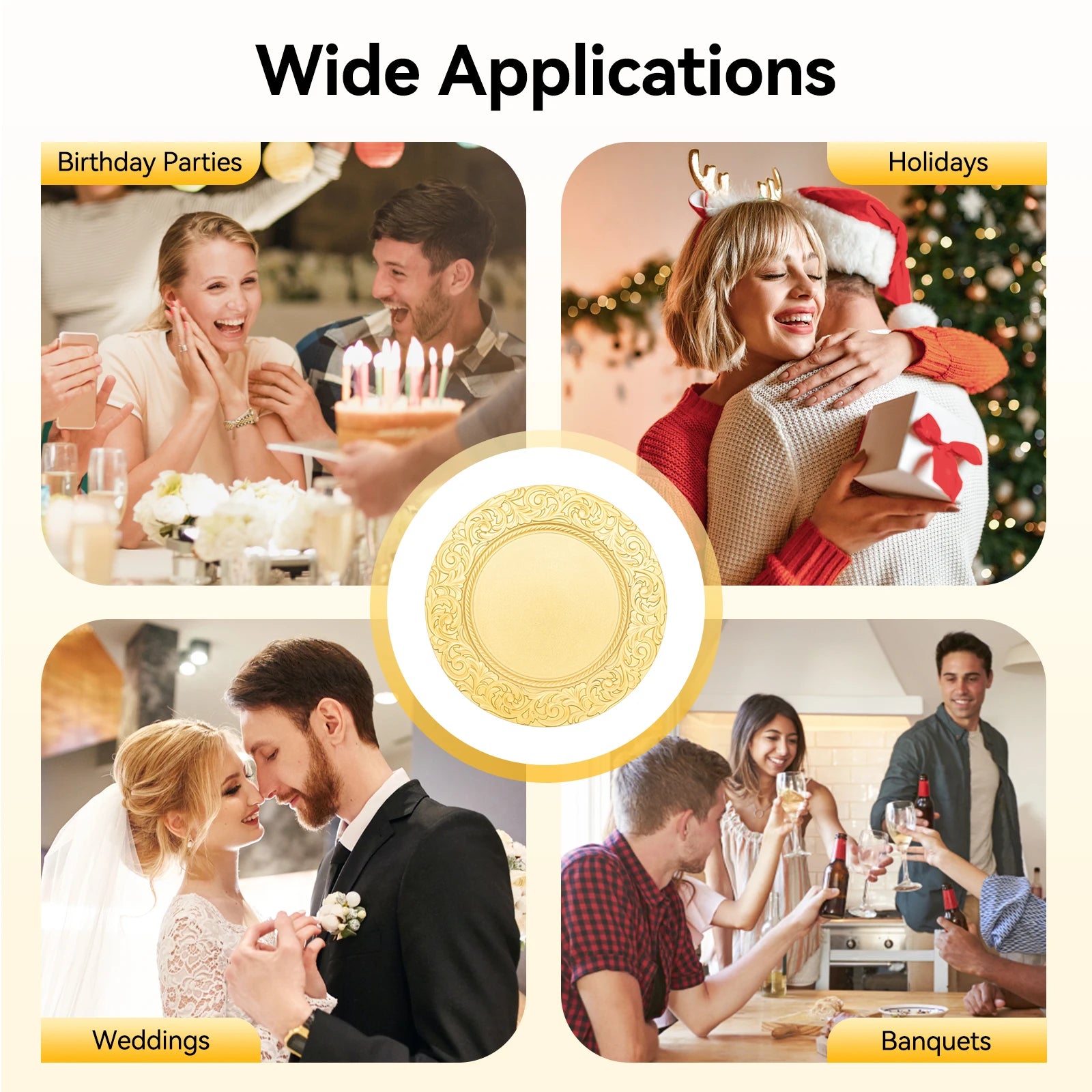 Elevate your table with a 100-piece Round Charger Plates Set that adds timeless elegance to weddings, banquets, and upscale gatherings.