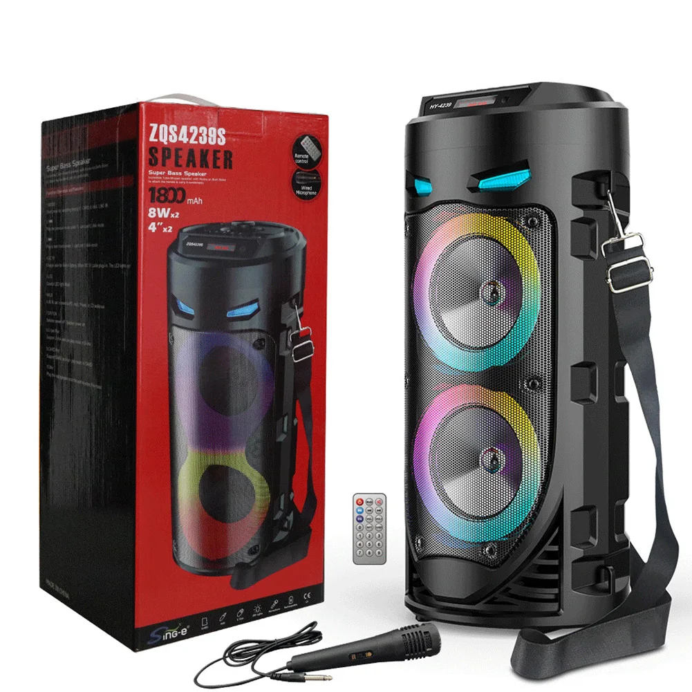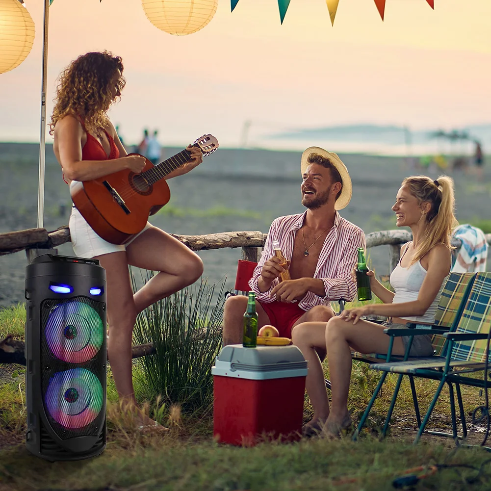 Bluetooth-Compatible Speaker Portable Speaker with Double Subwoofer Deep Bass Lights Wireless Stereo Speaker Support USB/TF/AUX/FM/BT/MIC Outdoor Speaker for Home Outdoor Party Gifts Features: 1.Multi-Functionality: This BT speaker features Bluetooth-compatible, radio, USB/TF card, and MIC inputs, providing a wide range of options to play your music effortlessly and with style. 2.Vibrant LED Lights: Equipped with adjustable LED lights, this portable speaker enhances any party atmosphere by syncing the light effects to your favorite tunes. 3.Surround Sound: Our wireless stereo speaker delivers immersive surround sound for an upgraded audio experience that impresses with every use. 4.Multiple Connectivity Options: Easily change between different music sources with support for radio, microphone input, and storage card playback on this versatile loud boombox. 5.Portable and Easy to Carry: The outdoor speaker is lightweight and compact, with a convenient handle for easy transport to any location, making it a great choice for parties in various settings. Specification: Origin: Mainland China Size: 410.00x166.00x166.00mm/16.14x6.54x6.54inch Material: Plastic Speaker Type: Portable Connectivity: Wireless Battery: 18650/3.7V/1800MAH Speaker: 4 inches*2 Power: 16W Machine size: 166*166*410mm Note: ![]() 1 x Speaker 1 x Microphone 1 x Remote Control 1 x USB Charging Cable |