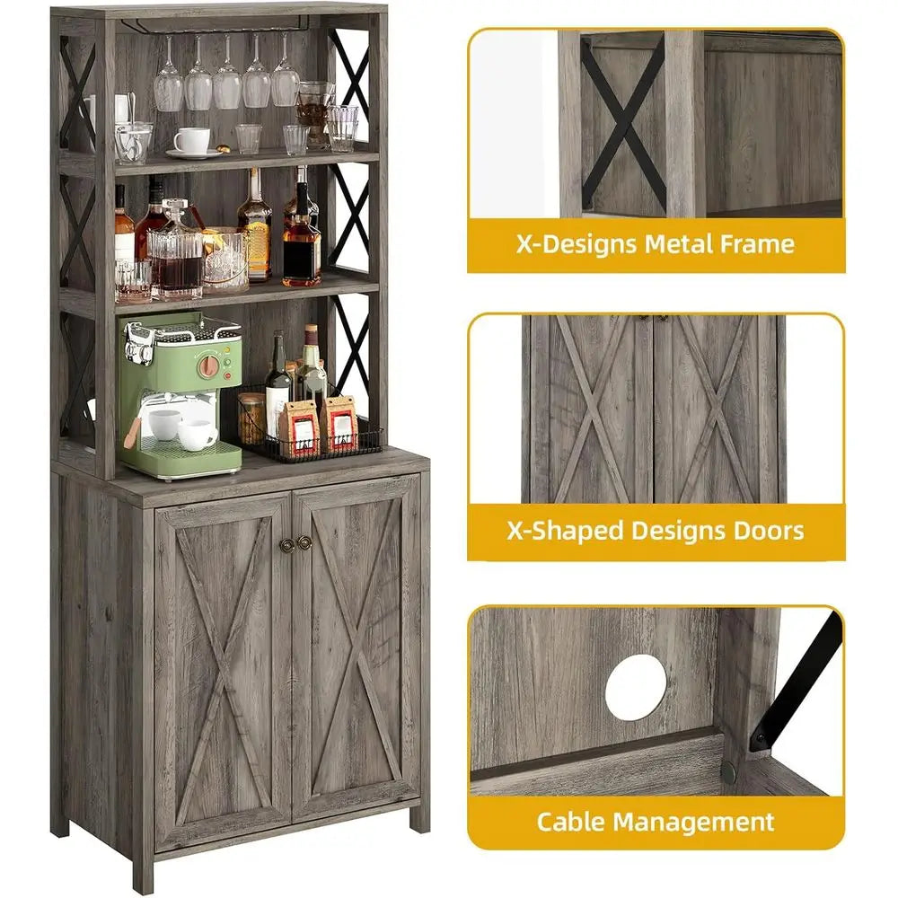- Upper wine rack holds 5–8 glasses and keeps stems organized, while three open shelves welcome coffee makers, toasters, bottles, or vases.