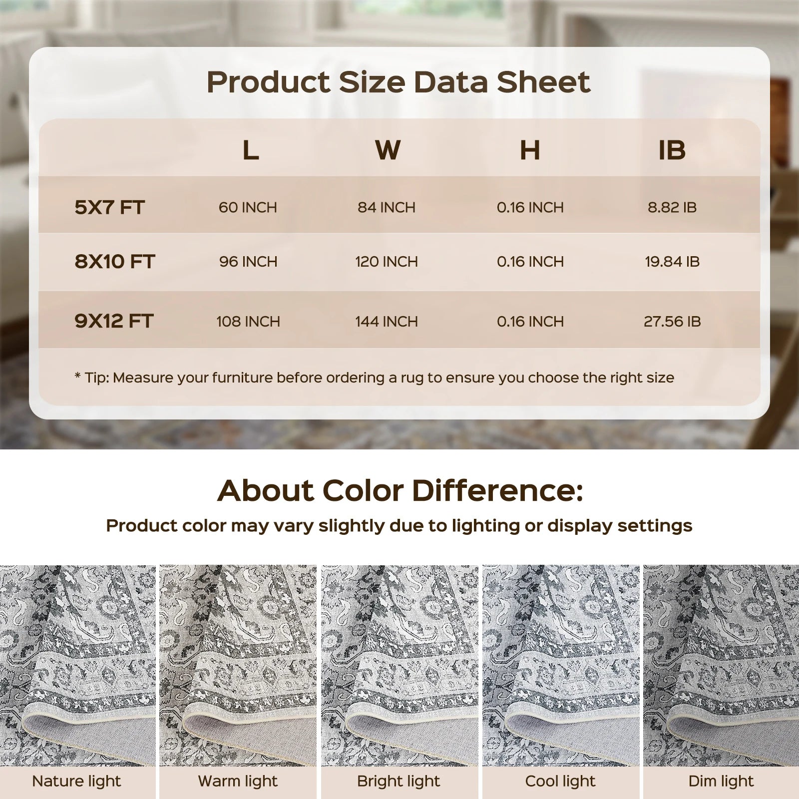 - With a generous 9x12 ft (270x365 cm) footprint, you’ll anchor large living rooms, bedrooms, or hotel suites and define seating areas with elegance.